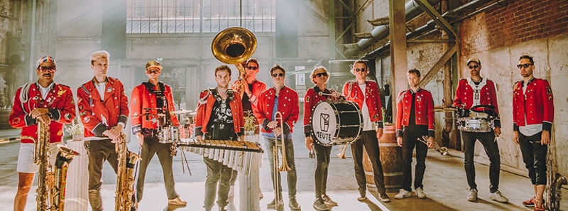 La basse résonne, les confettis explosent et les uniformes rouges brillent dans la lumière stroboscopique. E combiant techno hypnotique et musique de fanfare, MEUTE fait le buzz à travers les continents depuis 2016.